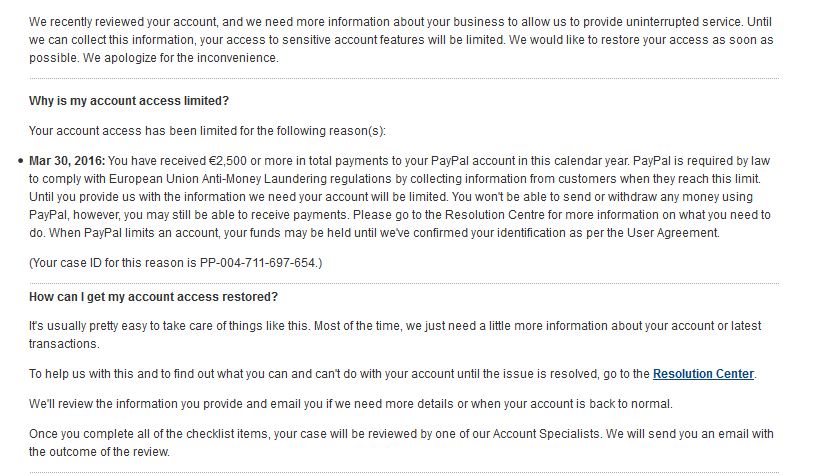 PayPal unfriendly practices SIP software development Mizutech Apr 04 2016 PayPal unfriendly practices Today morning I entered into my PayPal account just to realize that my account access has been limited. This is the warning I got after login: I don't know if anybody else have the same feeling, but after such kind of tricks, I don't really feel that my money at PayPal is secure. They are blocking my account, without any preliminary notice or warning. It already happened before for other questionable reasons. Why they just can't send an email or a notification that I have to resolve problem X within Y days, and let me continue to use my PayPal account normally meantime? I am an old PayPal user with continuous usage and with frequent biggish transactions. Yet they treat me like an enemy. I could agree that this would not be such a big issue if it could be resolved quickly. However now I am stuck with their form as I completed everything and uploaded documents (my id card, passport, driver license, company papers, etc), but at one of the questions (filling up the "director" details) I got an error impossible to pass. They are actually asking the same things what I already uploaded long time ago, but now I am unable to complete the process due to a bug in their software, so my account remains blocked. I sent them an "email" from their "Help" form, but I all get was an auto-response message, repeating the same things which I already can read from their website, treating me as a stupid, not worth the time to properly answer my request by a human. These kind of practices always scares me as I thought that an important role of a financial institution should be to give a strong secure feeling for their customers about their money. I don't have this feeling with my PayPal account at all. Actually now I can imagine my PayPal account being blocked at any time, without real reason, losing all my money with nowhere to complain (Bad phone support after long IVR wait times). The only reason why I am using PayPal now is because there is no other/better alternatives. I think that there is a big hole in the market here waiting for a new startup. Stripe sounds good for US customers, but not for the most parts of the world (I am in Romania). Update: A few hours later and my PayPal account is completely blocked. I can't even login now. Update2: After 3 days and all these scary things I finally received a message from PayPal that my account is "restored" now. My PayPal account is available again and I am preparing for the next "event".